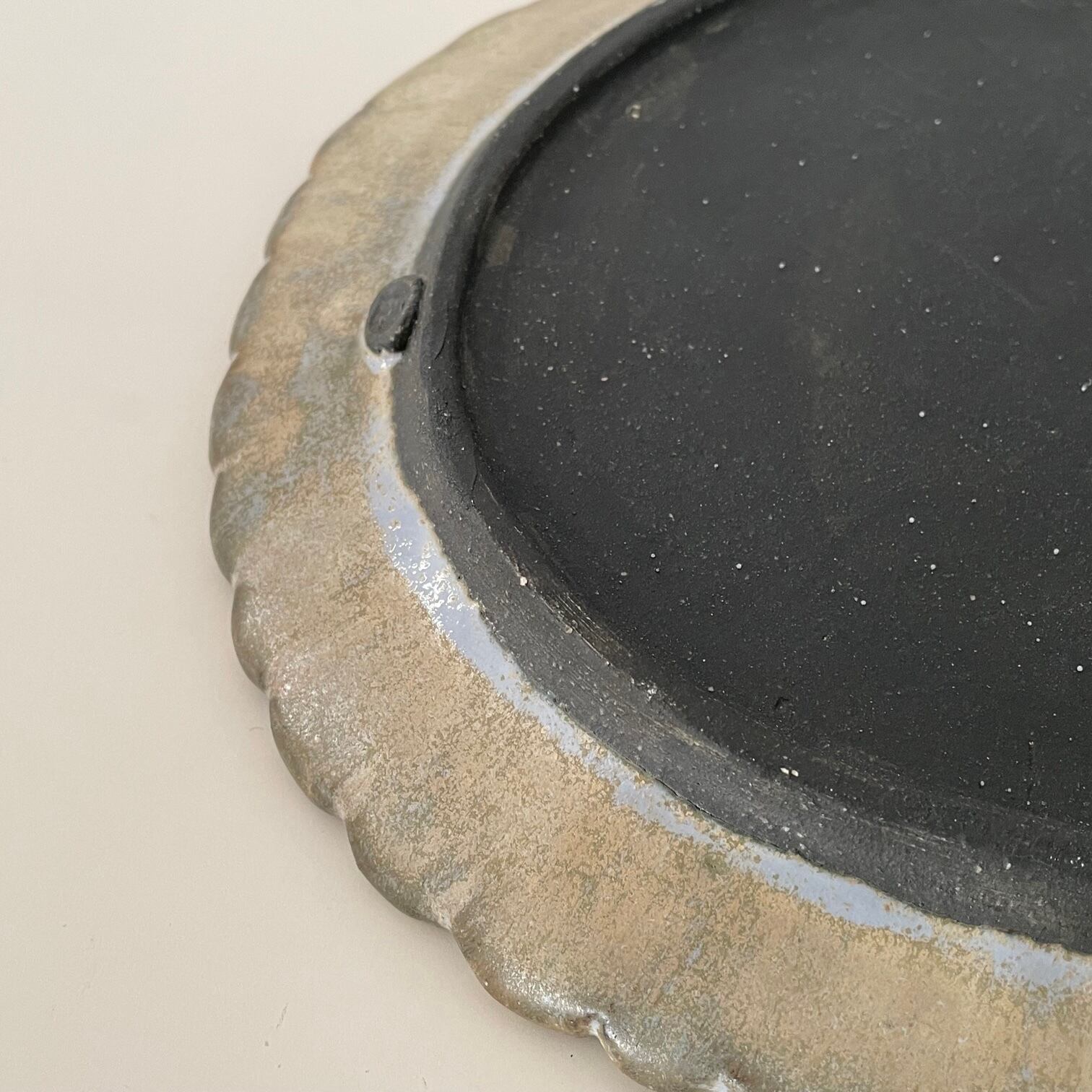 微妙な色合いが素敵なオーバルのお皿です。アンティークのようにも見えてエレガントで風格があります。茶色のようなカーキ色のような見え方ですが、土台は黒い土。