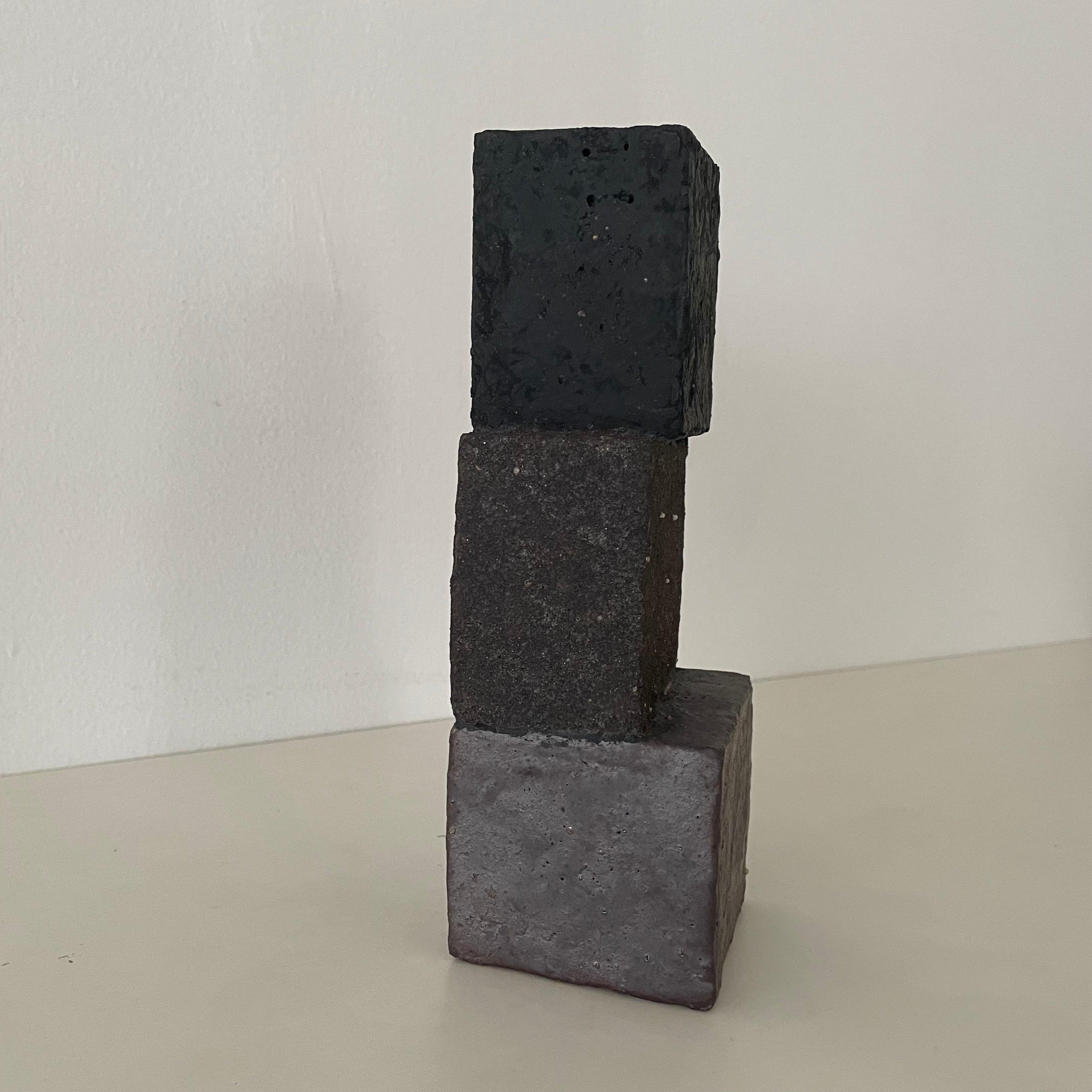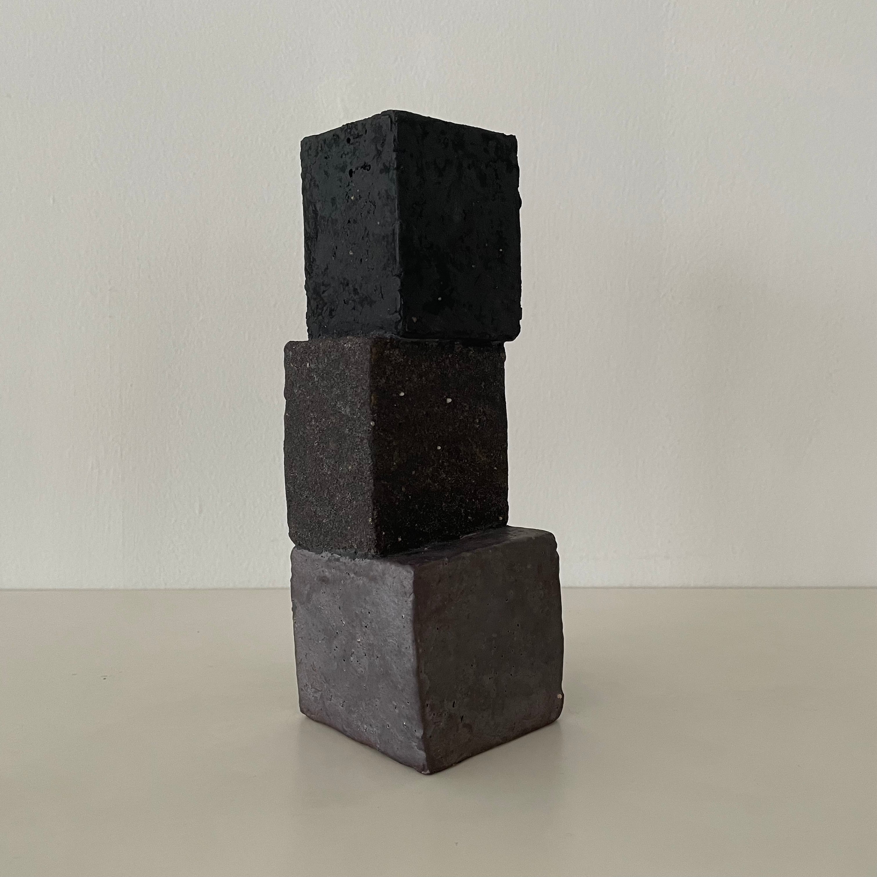 キューヴを組み合わせて微妙にずらしたようなカタチ。黒の色がキューヴそれぞれに違います。入口は丸が4つ。穴の位置から底までは20,5cmです。穴の大きさは、大2と小2。小さい方の穴に野生ミントの太めの茎を入れると、少し茎が傾く余白があります。お花が直立せずに生けた花の雰囲気になりそうです (笑)