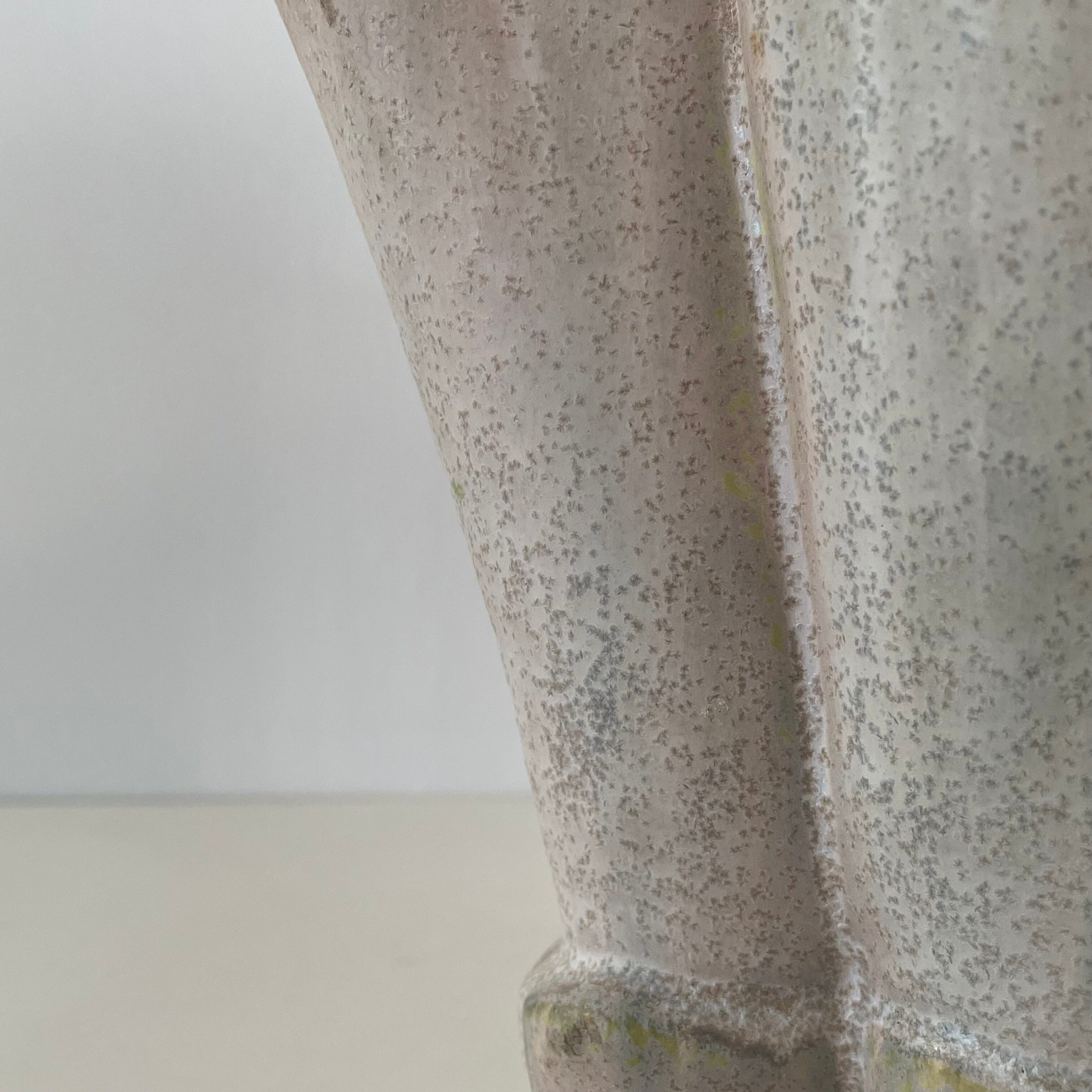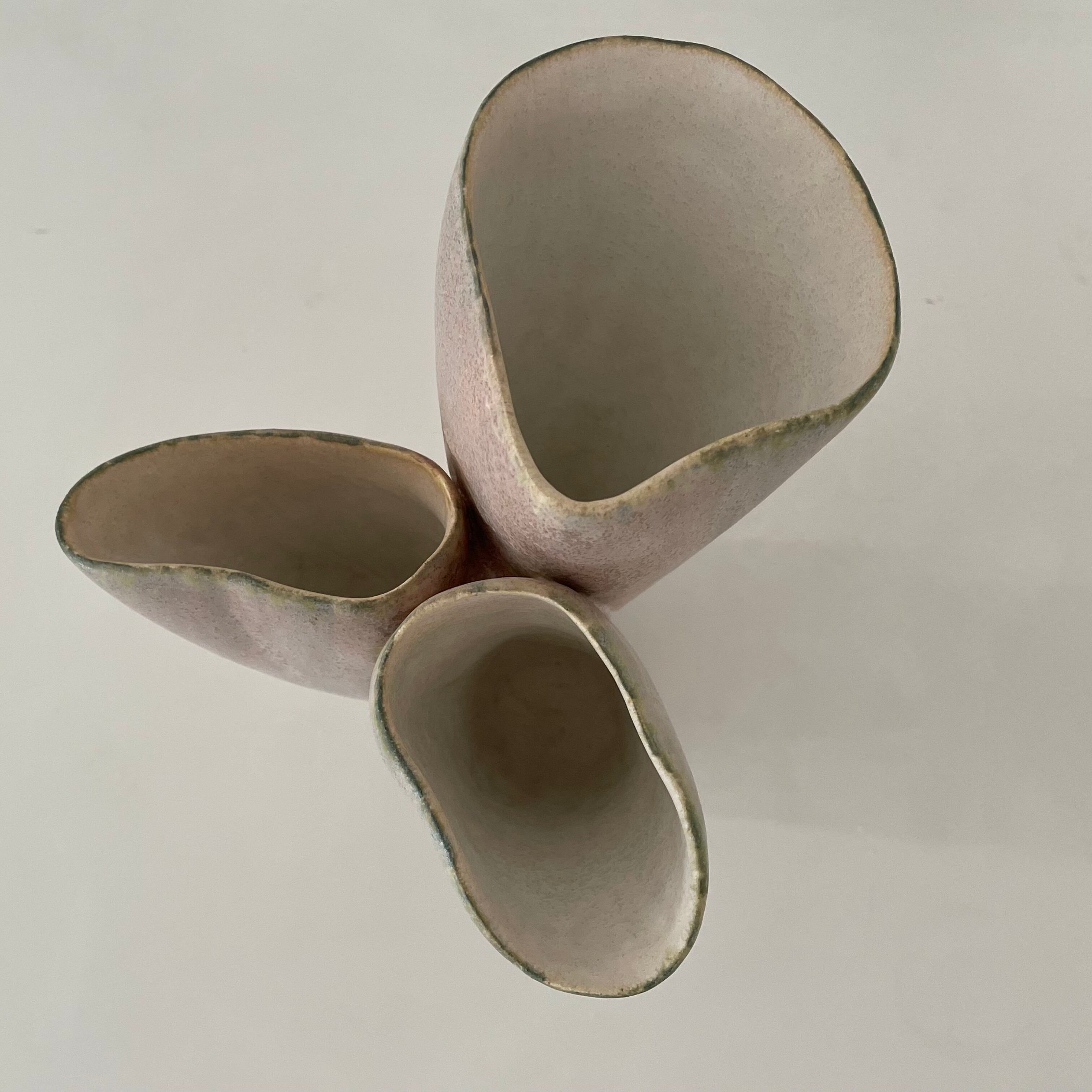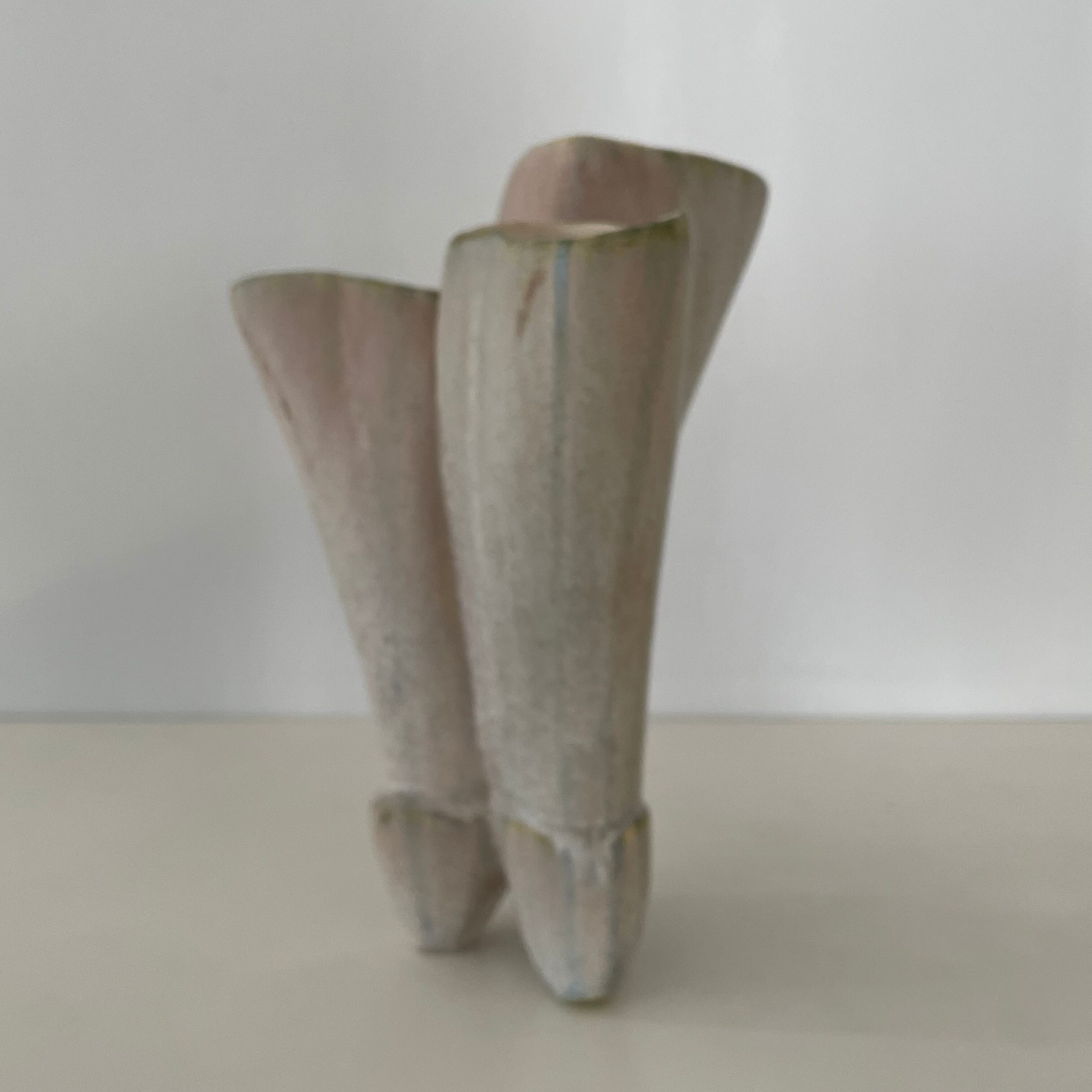 中里さんらしいオブジェです。モチーフは植物の形からでしょうか。柔らかな色は、よく見ると釉薬をなん度もかけていて、ニュアンスのある色合いが現れています。