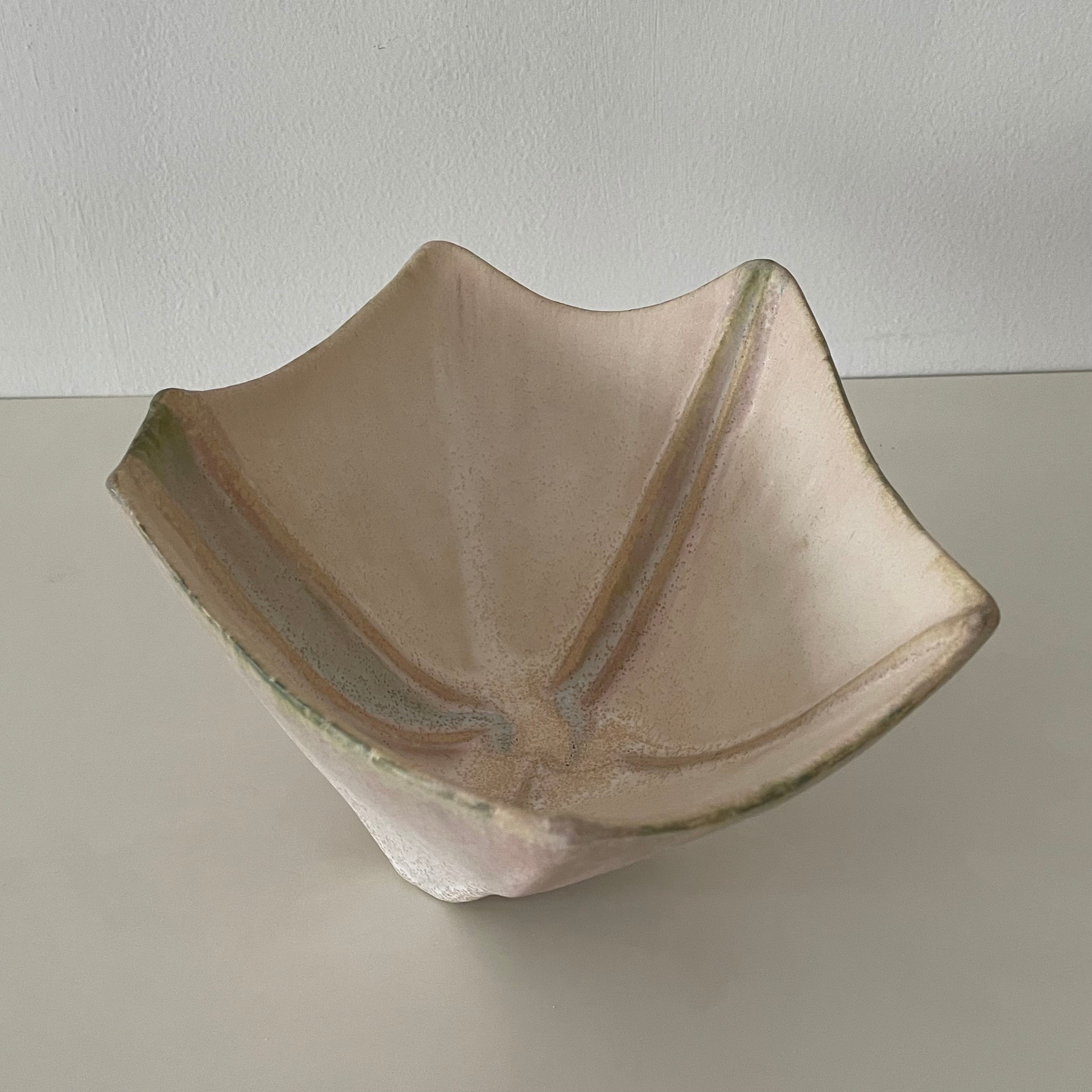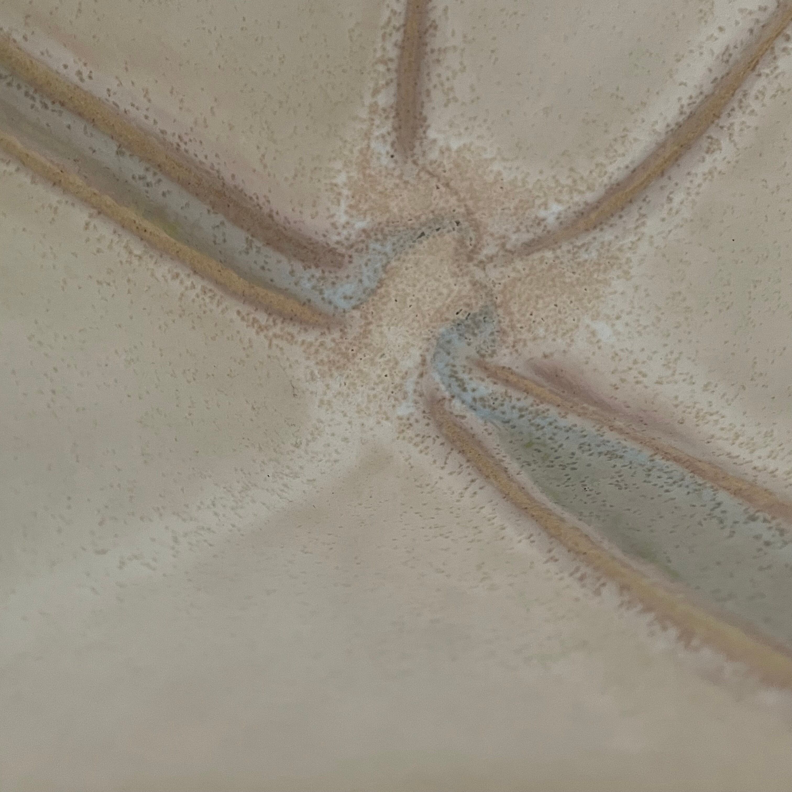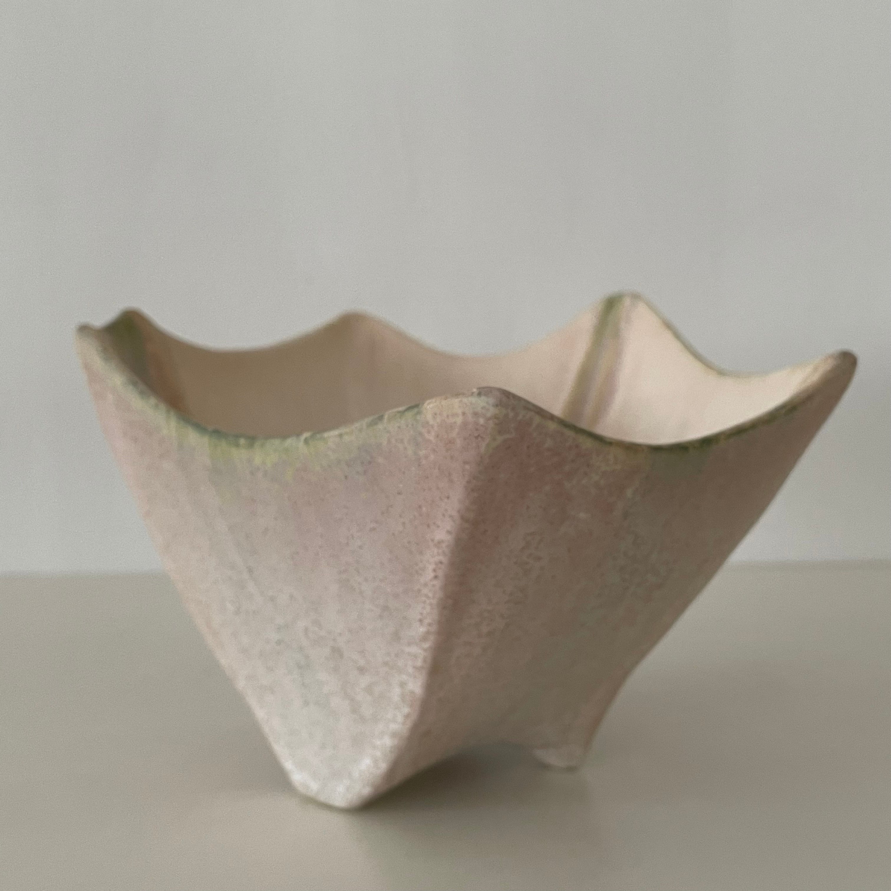 カタチは植物から着想を得て、シンプルにシンプルに。奇抜ではないのに中里さんの作品とすぐにわかる形と色のニュアンス。オブジェでもあり、鉢でもある。中里さんは結晶釉を使って植物の中にある微妙な色の諧調を再現しているのです。自然光で見るのが一番美しいかもしれませんが、柔らかな色は、ライトの下でもふんわりと別の顔を見せてくれます。さて、どの角度を正面にして飾りましょうか。360度眺めて発見がある作品です。