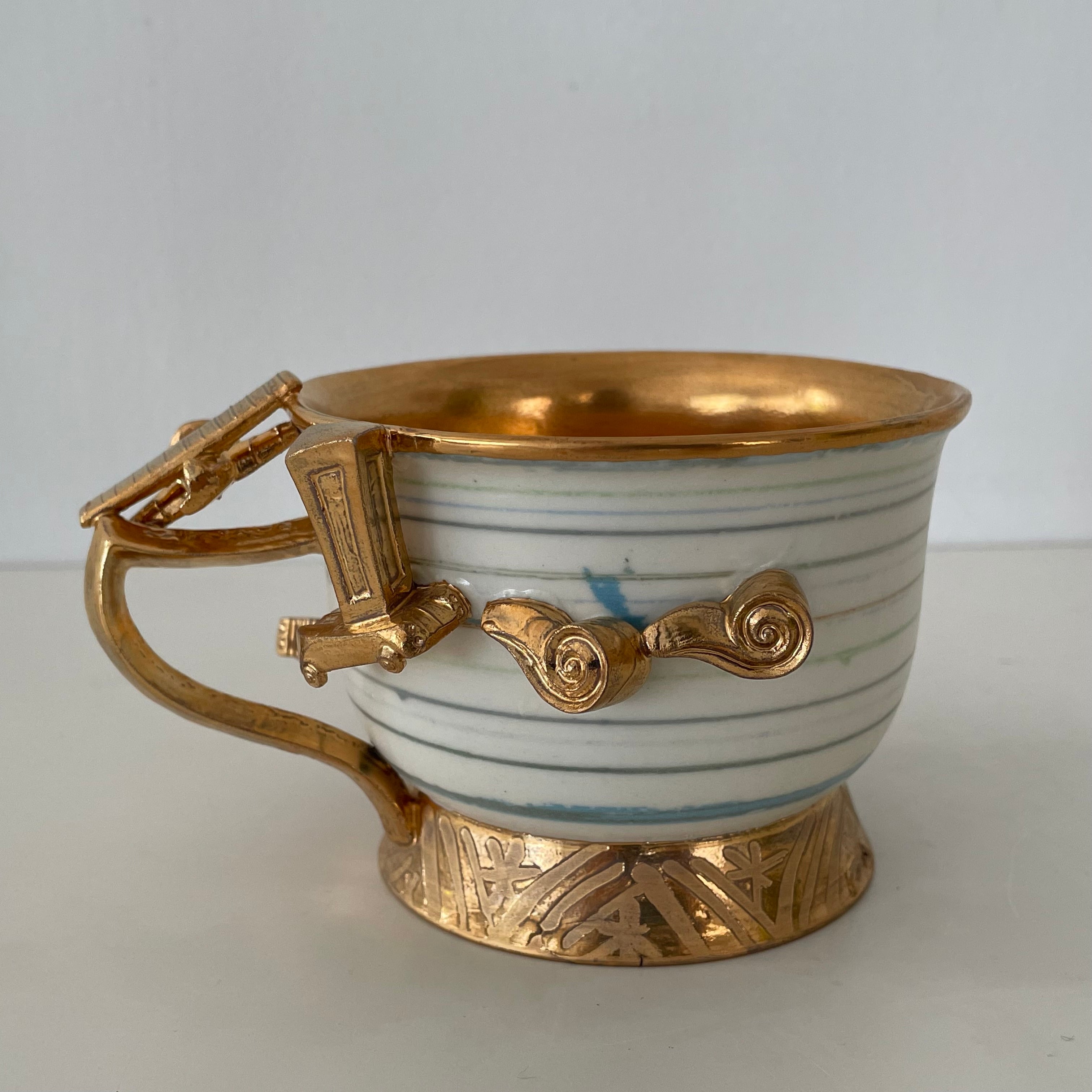 カップの内側が金色だと、紅茶の色がきれいに映えます。奇抜に見えて、持ち手のところ、指が安定するように飛行機の二枚羽根の角度が考えられています。さすが下さん。