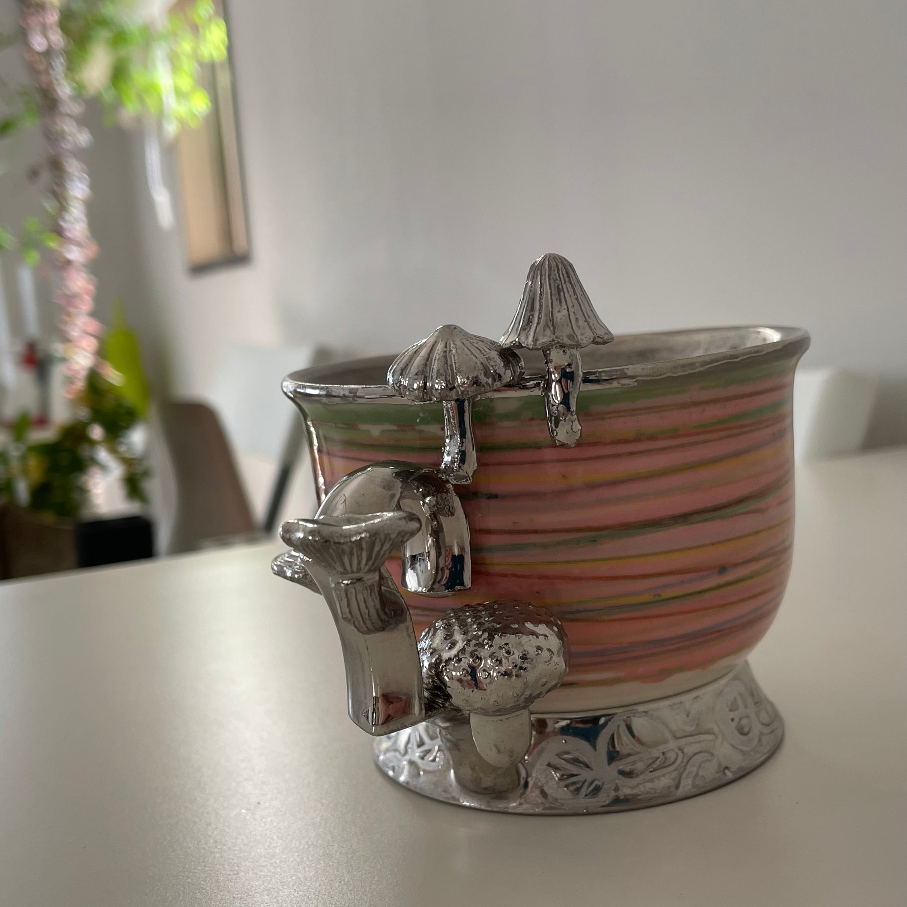 きのこが生えているマグカップ。シルバーのパーツは全て焼きものです。