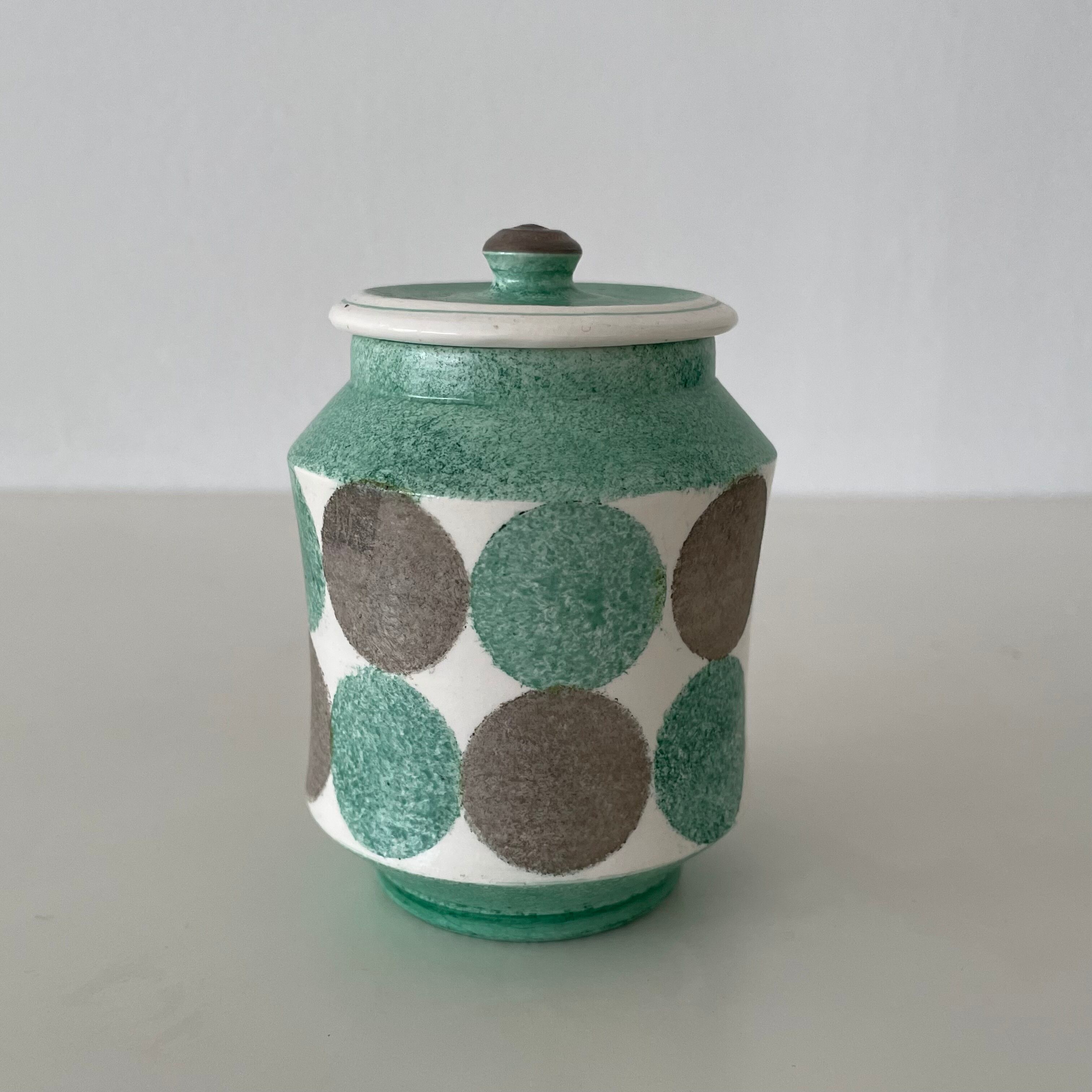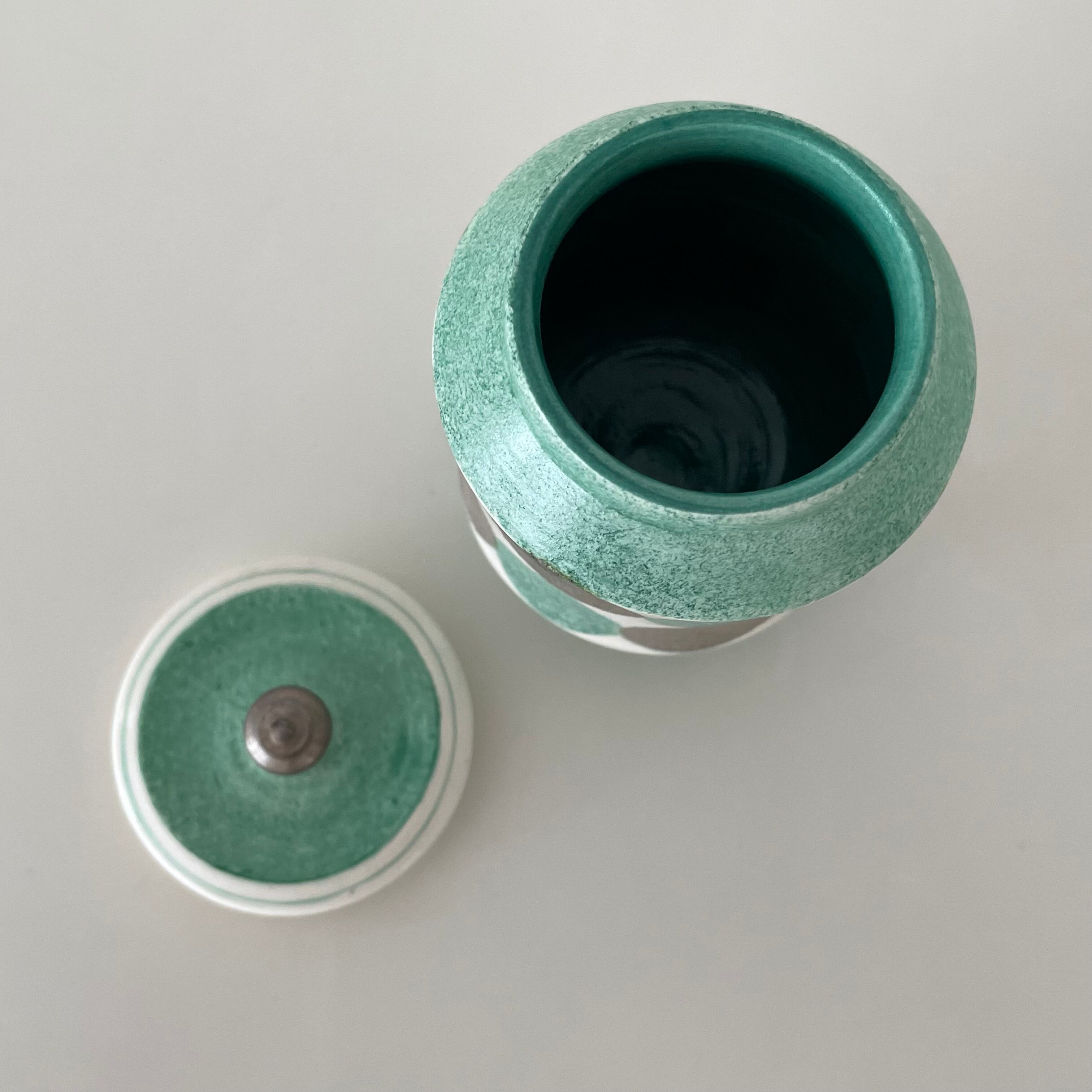 この愛らしいふたものは、若林さんがイタリアの薬局で見た薬瓶の形をイメージしているそうです。銀彩を使っているので、少しずつ銀色が渋く変化していきます。グリーンと白の爽やかさが、イタリアの太陽の木漏れ日のようです。中には、お抹茶を入れても良いですし、金平糖やお砂糖入れとしても使えます。